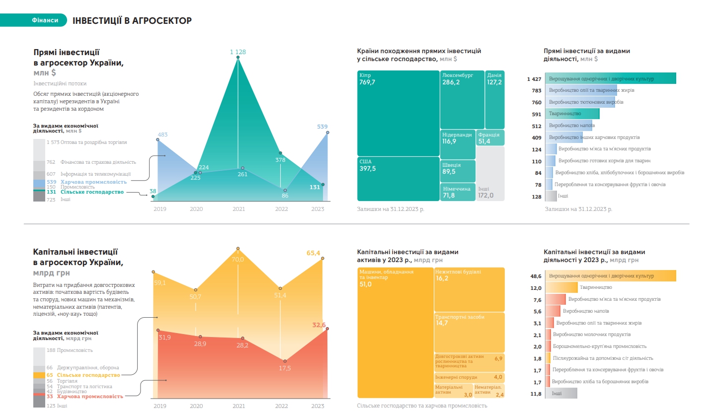 По итогам 2024 года объем капитальных инвестиций в аграрный сектор Украины составил более 45 млрд грн, что эквивалентно около 12% от общего объема инвестиций в экономику (по данным Госстата). Несмотря на войну, АПК остается одним из наиболее инвестиционно активных направлений благодаря экспортному потенциалу и приоритетному статусу в программах восстановления страны.