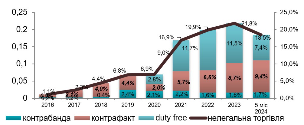 Также за 2016-2024 гг. изменилось распределение между «белым», «серым» и «черным» рынком исследуемой продукции в сторону увеличения теневого сегмента. Нелегальный рынок сигарет включает контрабанду – табачные изделия, которые нелегально ввозятся в Украину из-за рубежа, сигареты, маркированные Duty Free или предназначенные для экспорта, нелегально продаваемые, и контрафакты – поддельная продукция По оценкам экспертов, с 2016 по 2019 год «тень» возросла в 8 раз, составив 8,5%, в 2020 – 6,9%, а в 2023 году в четвертом квартале, по оценкам компании Kantar, доля тени уже составляла рекордные 23,5%, годовой показатель – 19%.