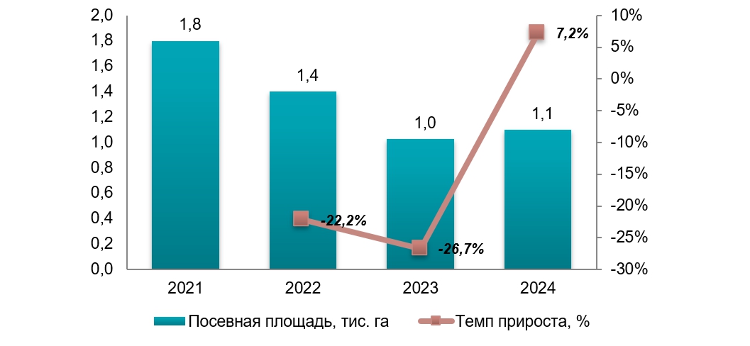 По данным Государственной службы статистики Украины, общая посевная площадь технической конопли в 2024 году продемонстрировала рост на 7,2%, до 1,1 тыс. га, после постоянного падения к 2023 году.