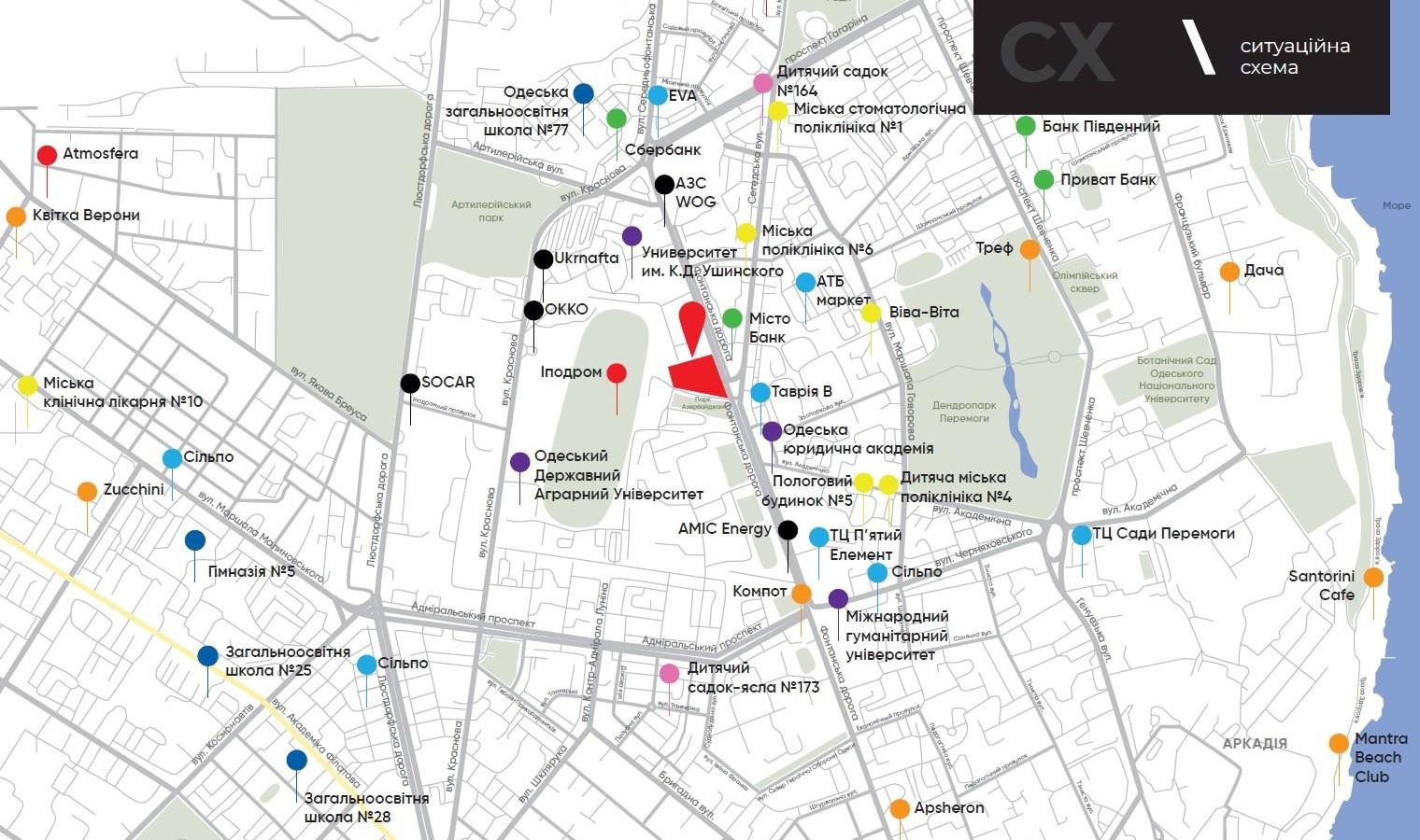 The property is located in one of the most prestigious and expensive districts of Odesa — a hub of business activity and premium-class residential development. Demand in this area remains consistently high due to its dense residential surroundings, strong tourist flow, and proximity to the city center (5 minutes by car). Within a 1 km radius are the Arcadia beach area and the Health Route. The location is characterized by stable commercial activity and strong pedestrian and vehicle traffic.