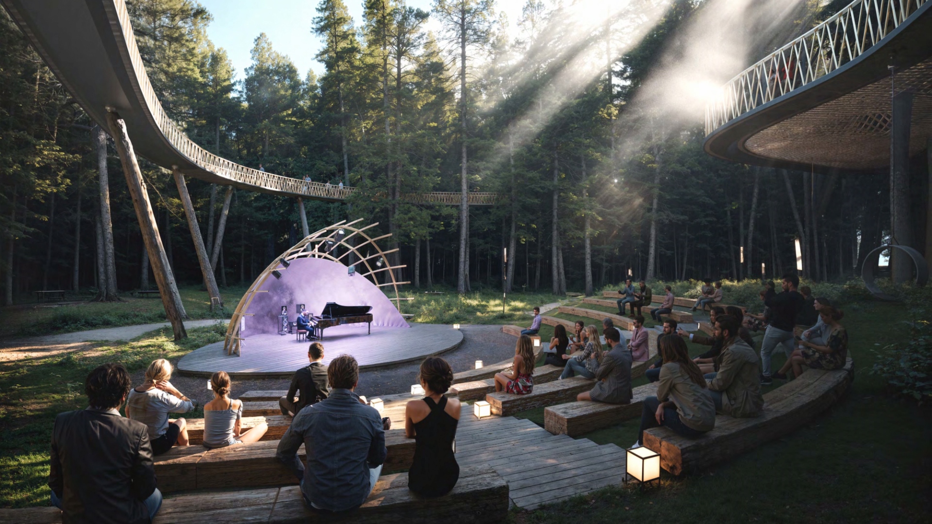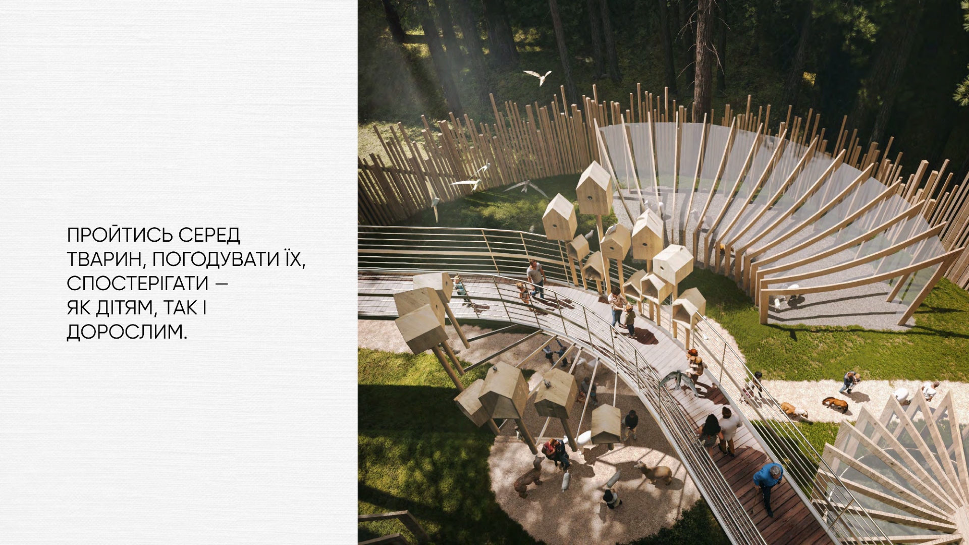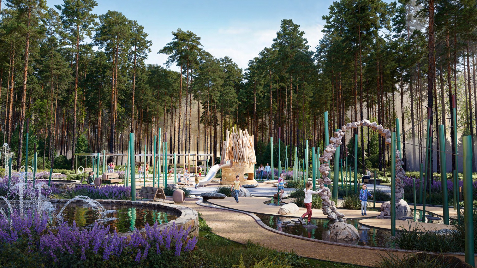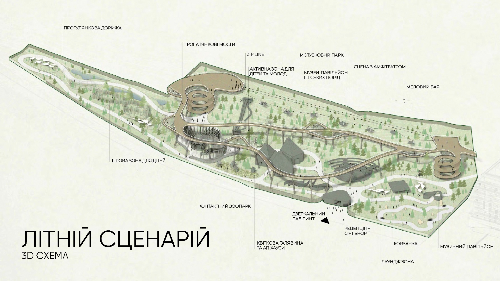 Эстетичный двухуровневый парк развлечений площадью 4 га является вторым независимым источником клиентов для ресторана, не зависящим от загрузки отеля. Парк включает: медовый коктейль-бар (F&B-синергия), сцену с амфитеатром (event-трафик), контактный зоопарк, зиплайны и верёвочный парк, зеркальный лабиринт, музыкальный павильон, катковую аллею (зимний сценарий), цветочную поляну с апихаусами, большие прогулочные мосты и водную зону для детей.