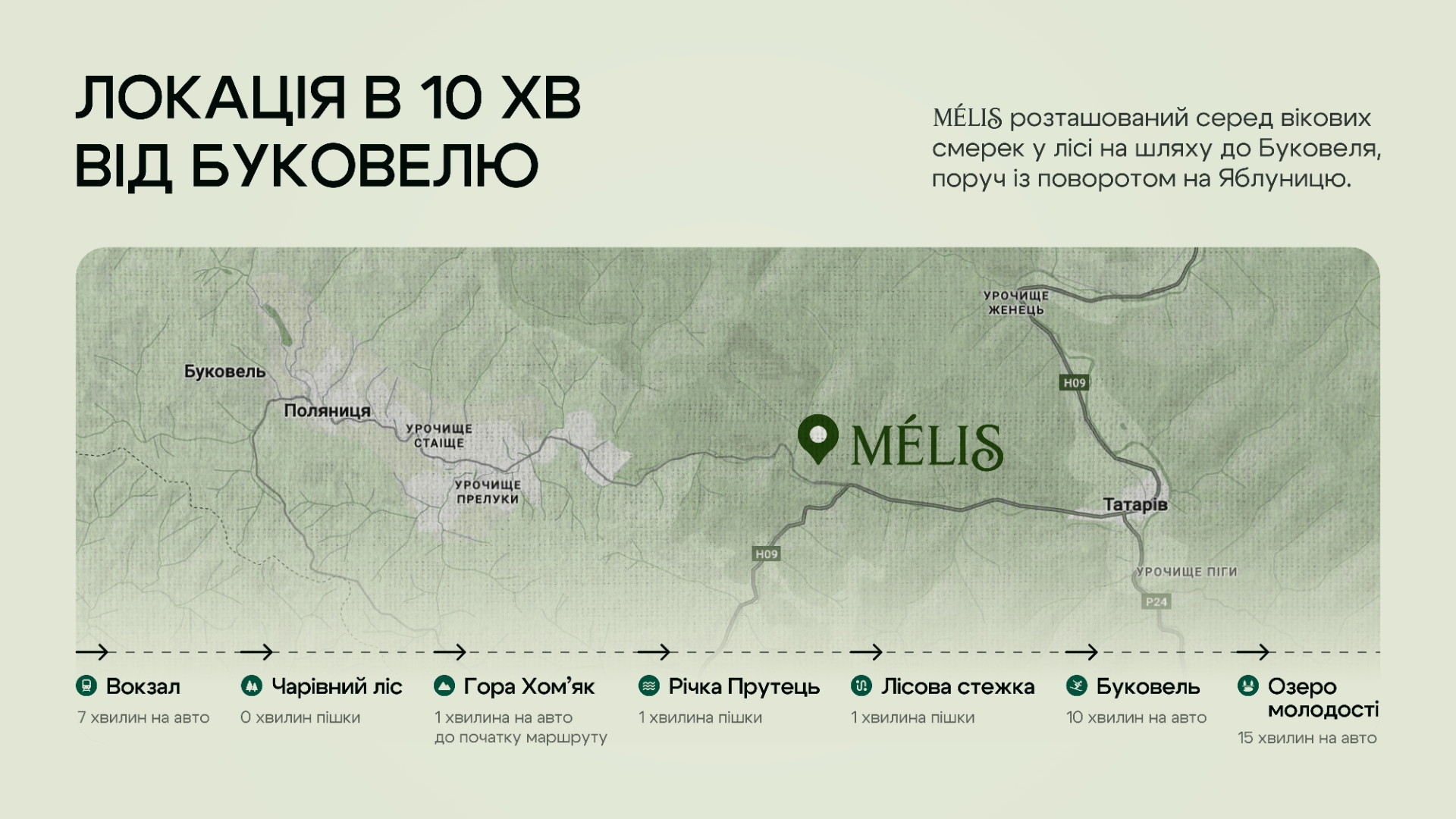 MÉLIS расположен среди вековых елей в с. Яблоница, в стратегической точке Карпатского курортного региона, на ключевом съезде с главной трассы по пути в Буковель — в 10 минутах езды от курорта.