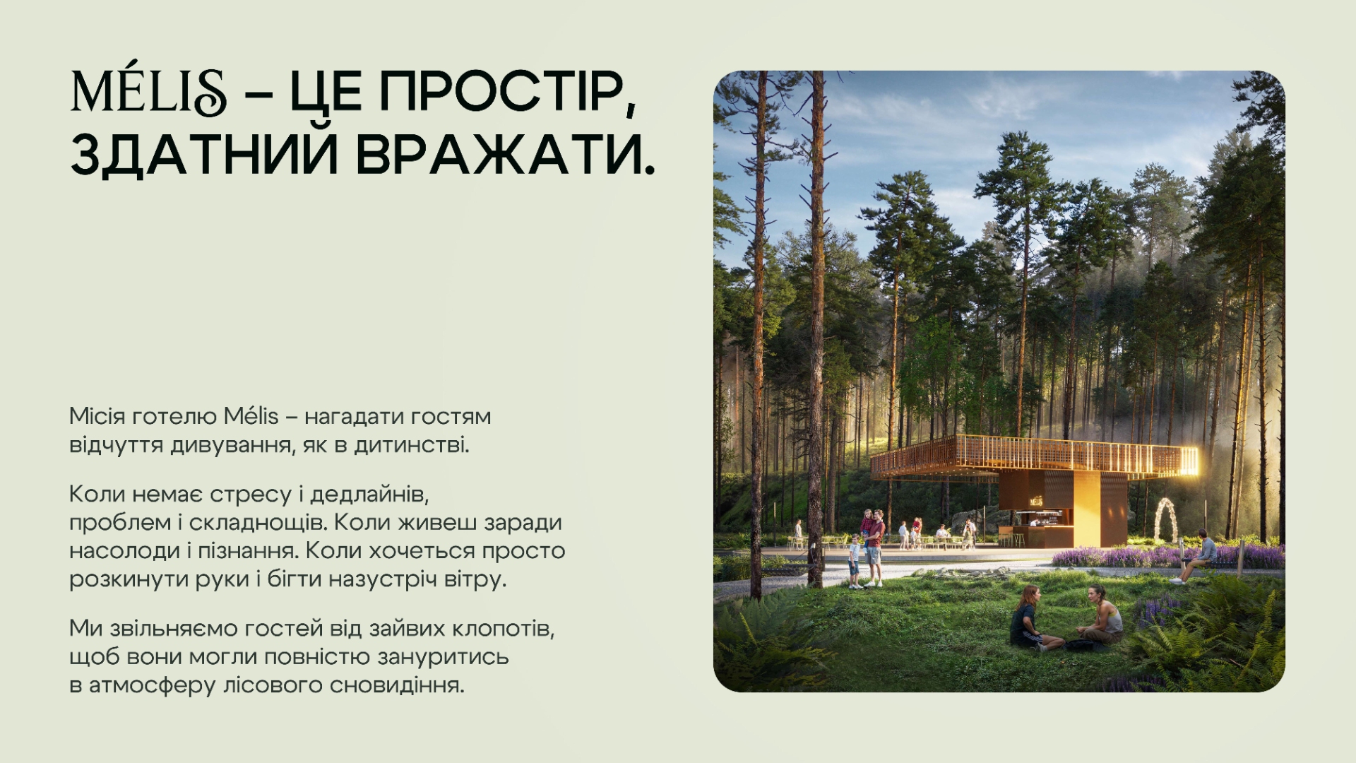 MÉLIS — это премиальный гостиничный комплекс на 337 апартаментов среди вековых елей в с. Яблоница, реализуемый в стратегическом партнёрстве NUMO Development (девелопер) и RIBAS Hotels Group (гостиничный оператор, 11+ лет, 55+ объектов в 4 странах).