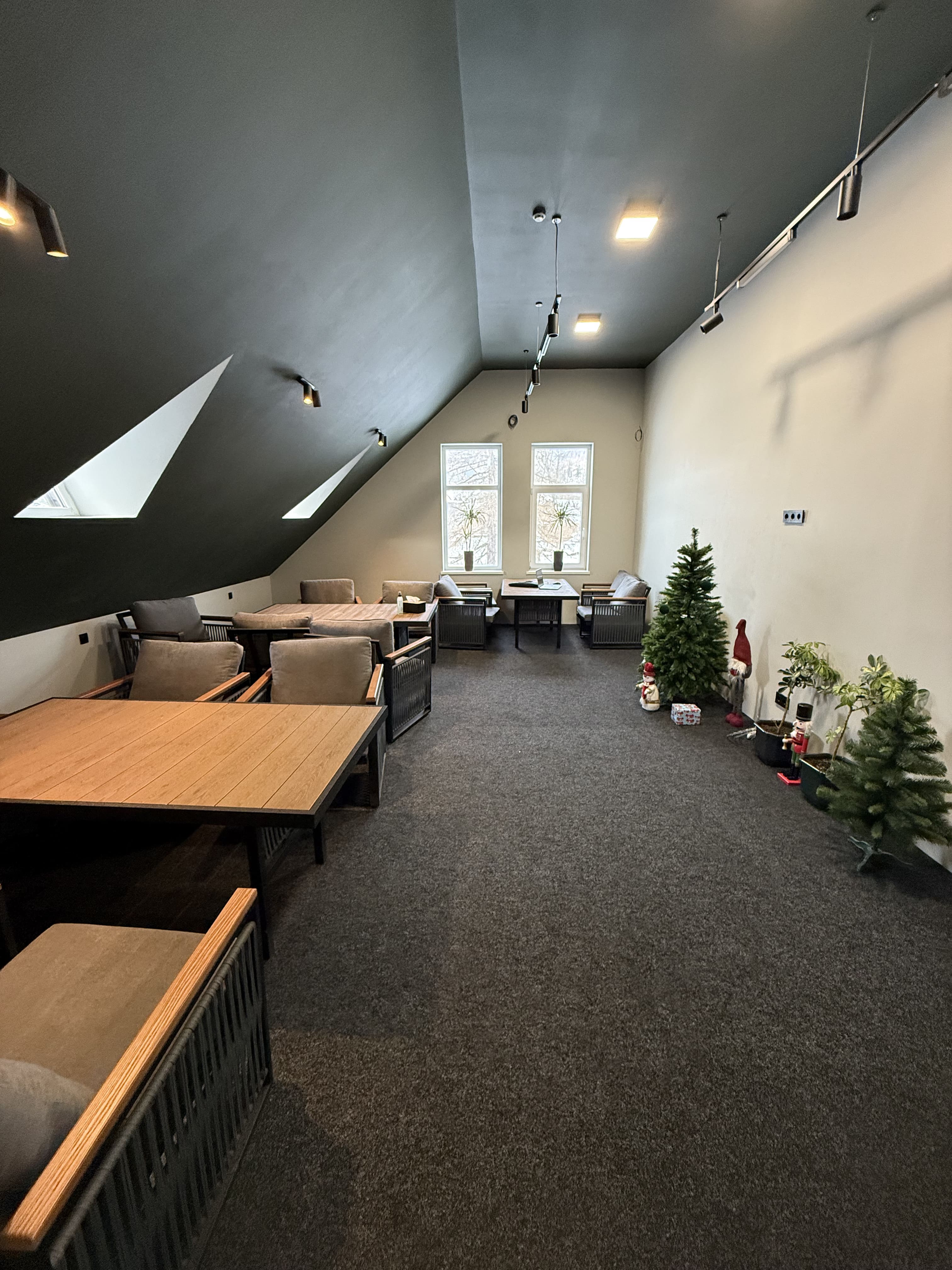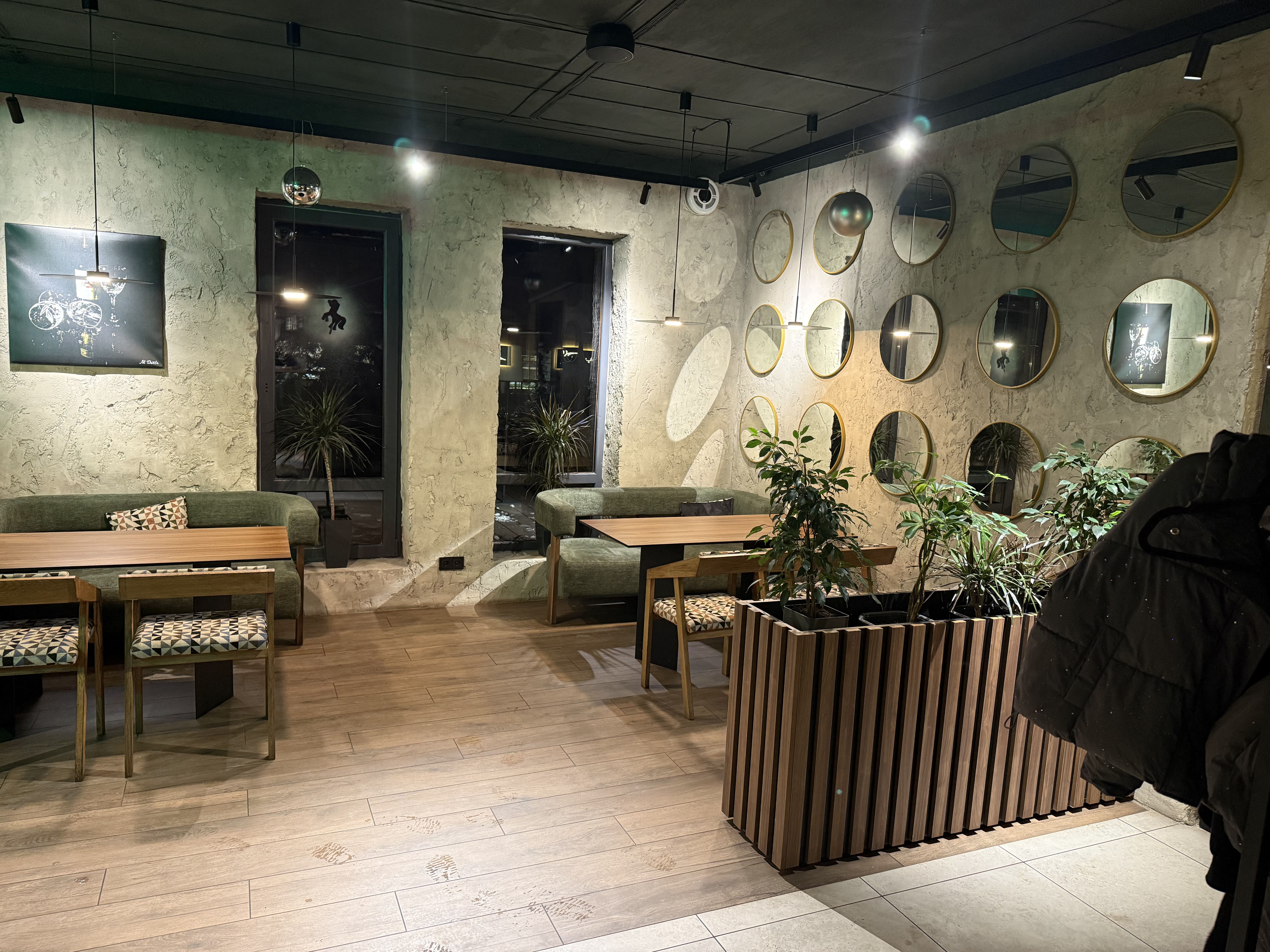 Ресторан включает два основных зала, летнюю террасу, детскую комнату и отдельный банкетный зал. Общая вместимость — до 80 посадочных мест.