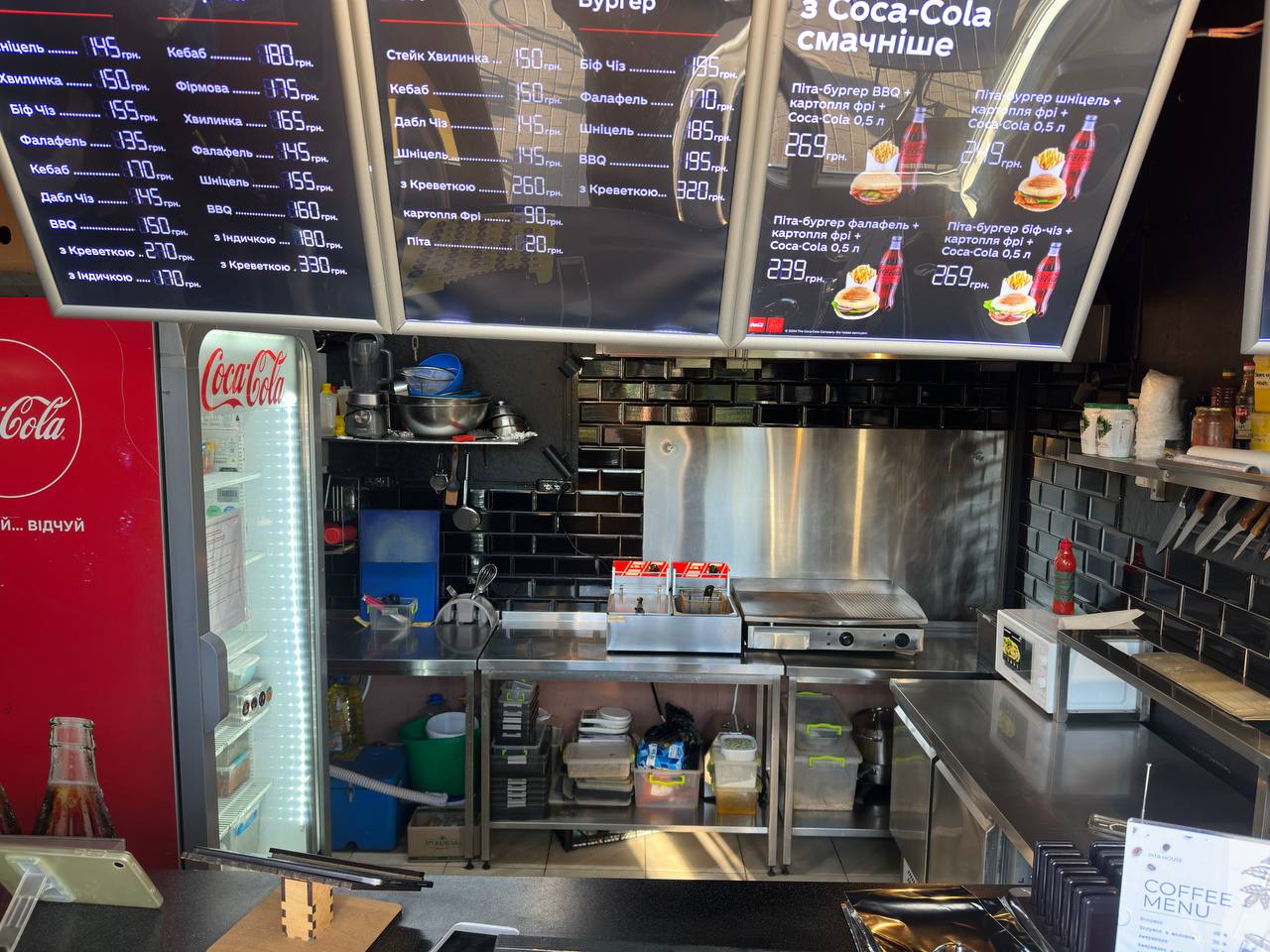 - Технологическое оборудование: грилли, фритюрницы, холодильники, морозильные камеры, холодильные столы, вентиляция, мебель из нержавеющей стали, мойки, бойлер, генератор, кухонный инвентарь.