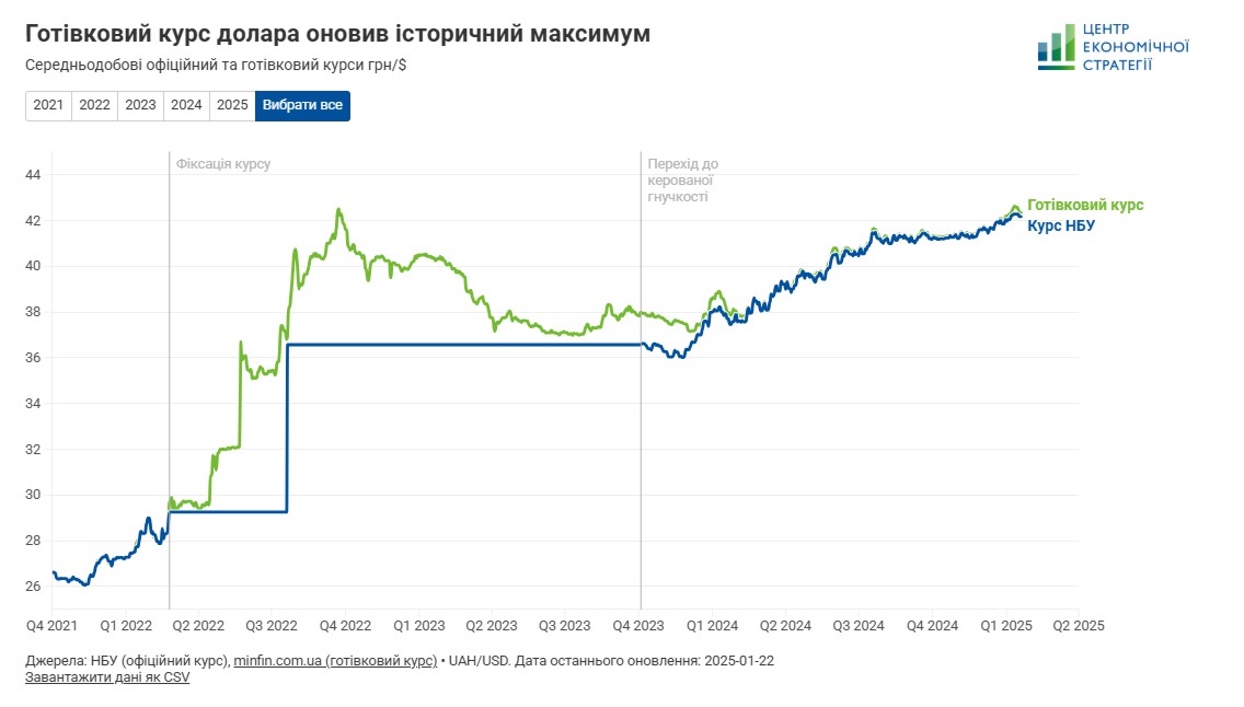 За майже три роки повномасштабної війни в Україні гривня знецінилась по відношенню до долара більш ніж на 10 грн. Нагадаємо, напередоні вторгнення рф в Україну, 23 лютого 2022 року, офіційний курс НБУ складав 29,25 за долар США. Станом на 30 грудня 2024 року курс НБУ досяг — 41,94 за долар США.