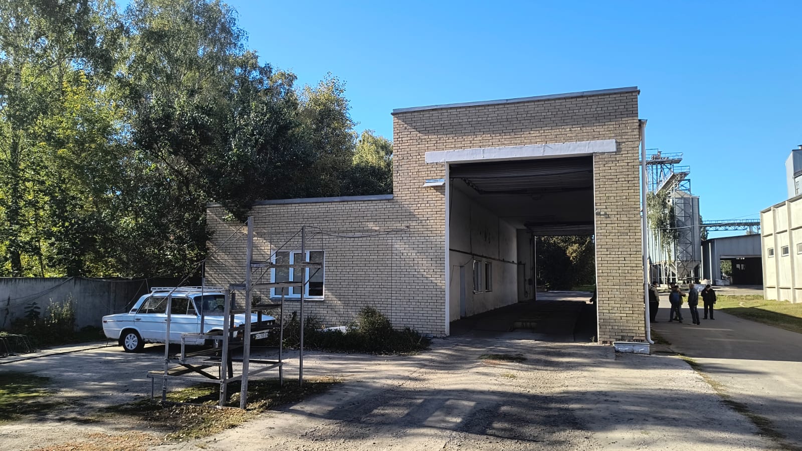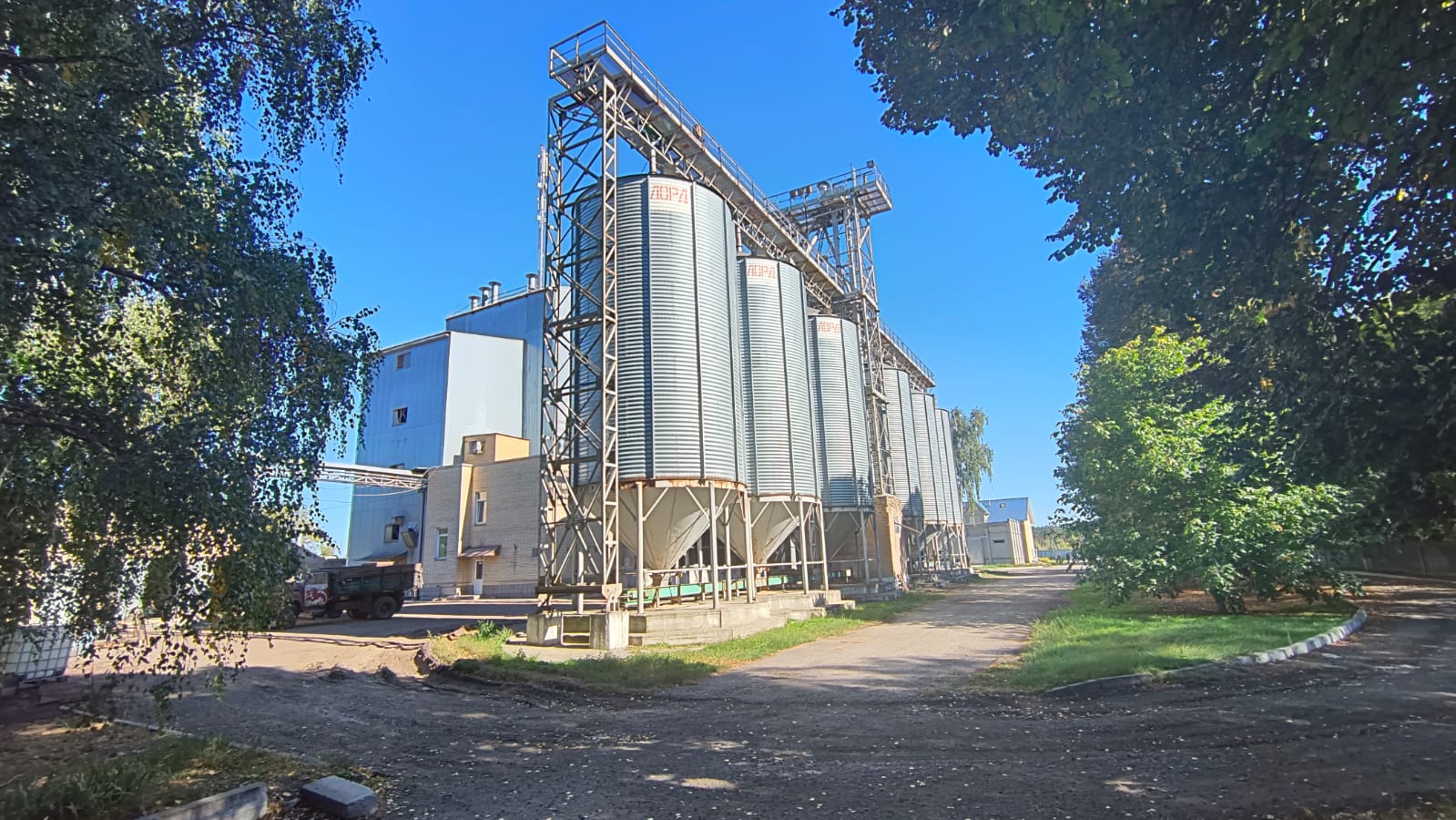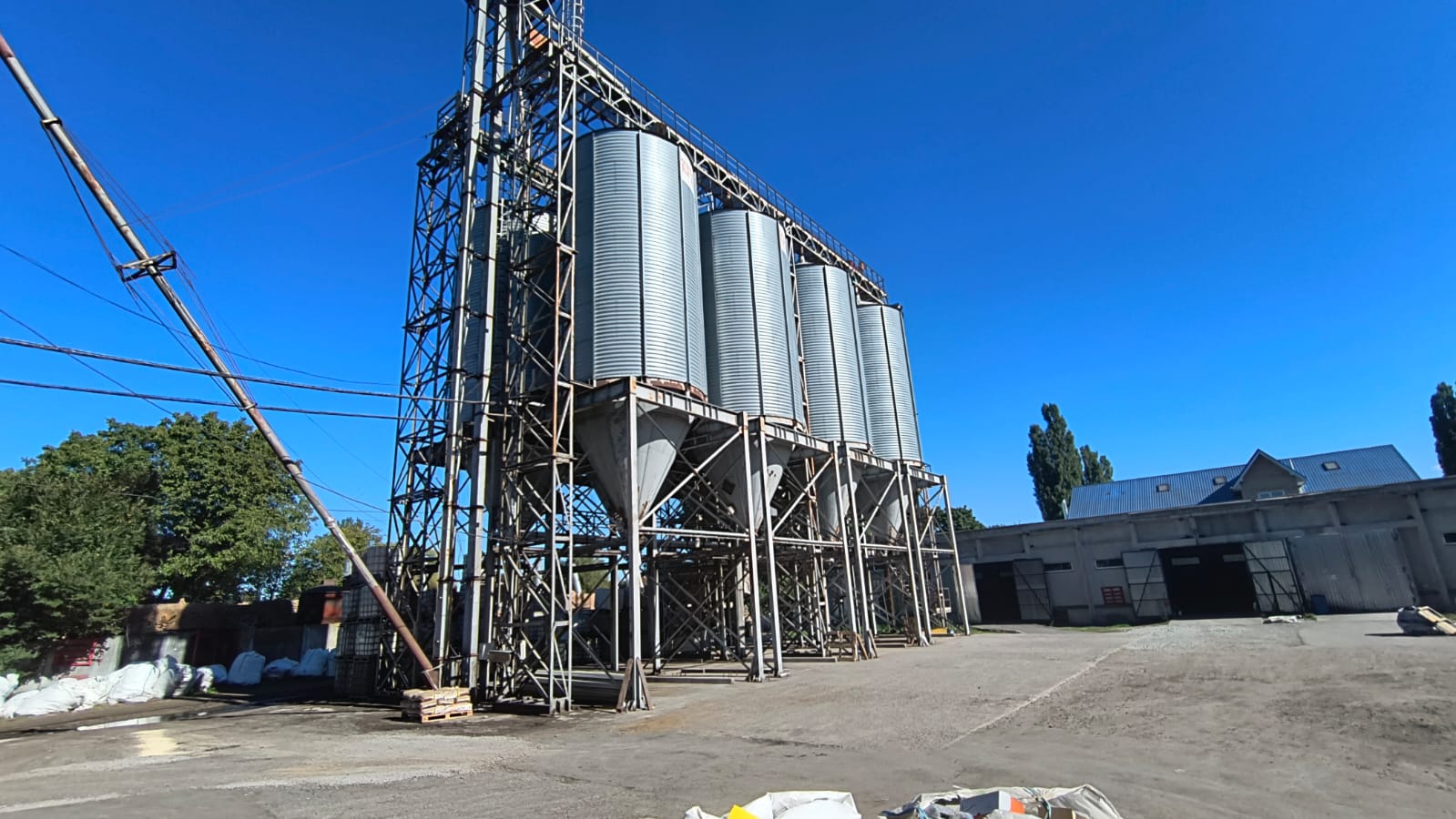 6 оцинкованих силосів (Ø5 м, висота 8 м, кут 45º) для зерна, з’єднаних із виробництвом ланцюговими транспортерами.