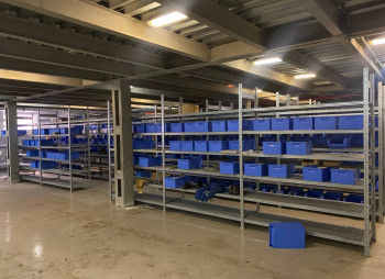 Складські приміщення обладнані 1-х рівневими складськими стелажами з контейнерами для зберігання та стелажами зі змінною конфігурацією виробництва SCHAEFER.
