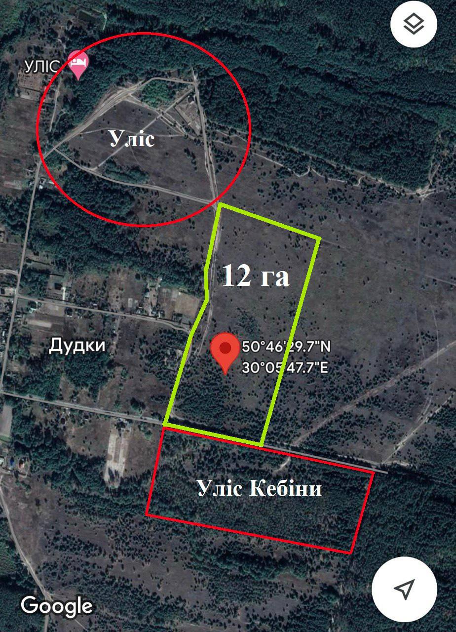 Продаємо 12 га в с.Дудки між двома чергами заміського комплексу "Уліс".