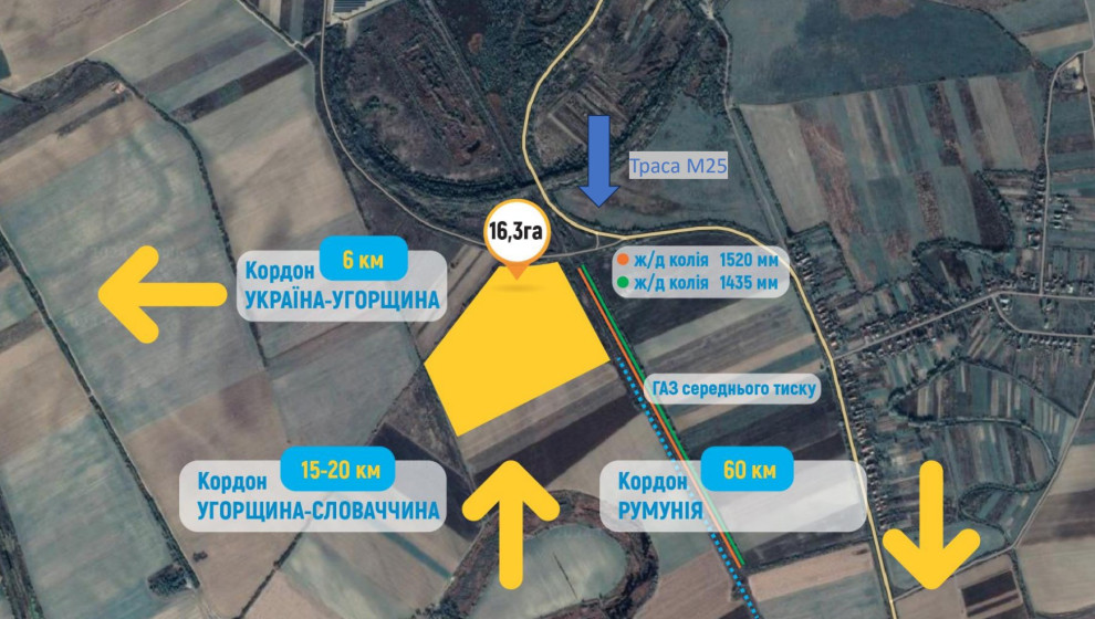 Згідно з документацією, ділянка має цільове призначення «для розміщення та експлуатації будівель підприємств переробної, машинобудівної та іншої промисловості». На балансі компанії, що володіє ділянкою, уже затверджені технічні умови на підключення до електромережі «Закарпаттяобленерго» (лінія 35 кВ, потужність – 4,99 МВт), а також погоджене приєднання до залізничної інфраструктури АТ «Укрзалізниця» обох типів колій – європейського (1435 мм) та ширококолійного (1520 мм). Відстань до колій – до 500 метрів.